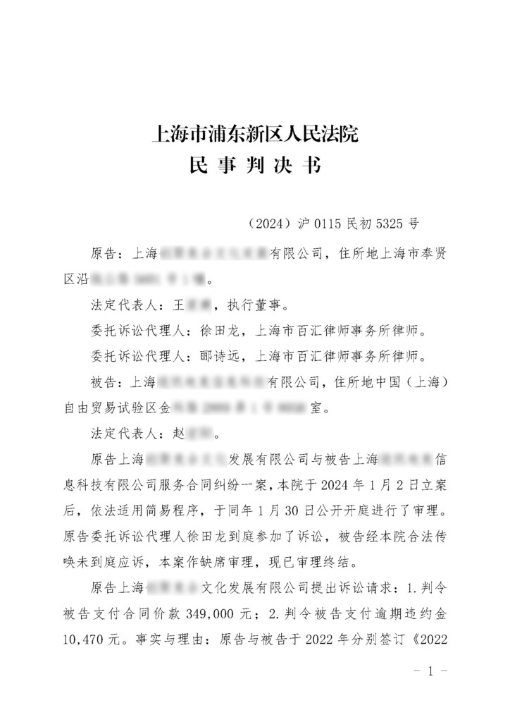 (2024)沪0115民初5325号-上海创聚竞合文化发展有限公司与上海珑讯电竞信息科技有限公司服务合同纠纷民事判决书_页面_1