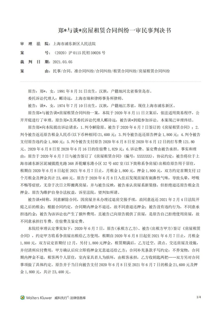 (2020)沪0115民初59026号-郑艺与谈玉房屋租赁合同纠纷一审民事判决书_01