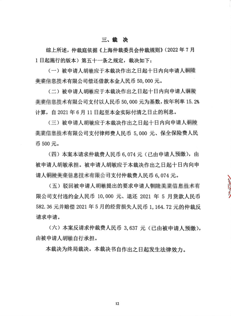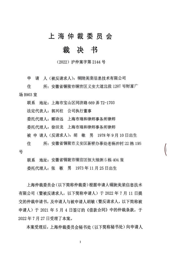 (2022)沪仲案字第2144号-铜陵美菜信息技术有限公司与胡敏借款合同纠纷_页面_01