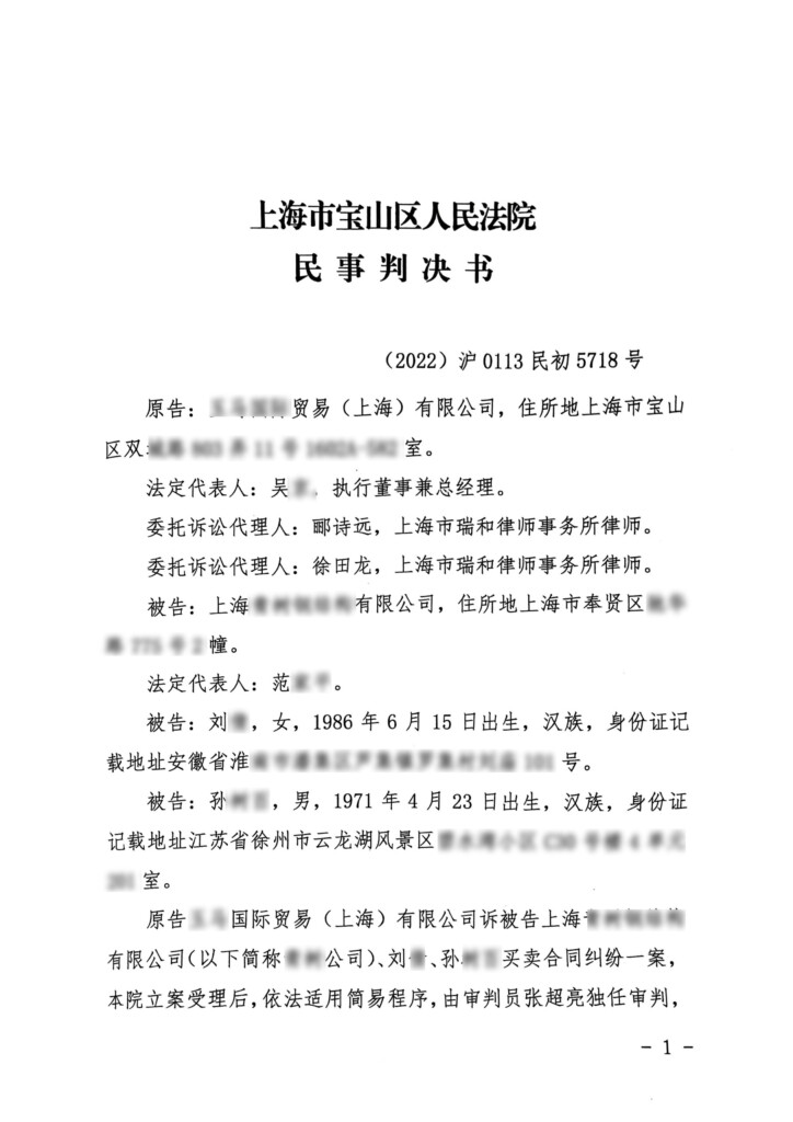 (2022)沪0113民初5718号民事判决书-玉马国际贸易(上海)有限公司与上海青树钢结构有限公司、刘倩、孙树百买卖合同纠纷_页面_1