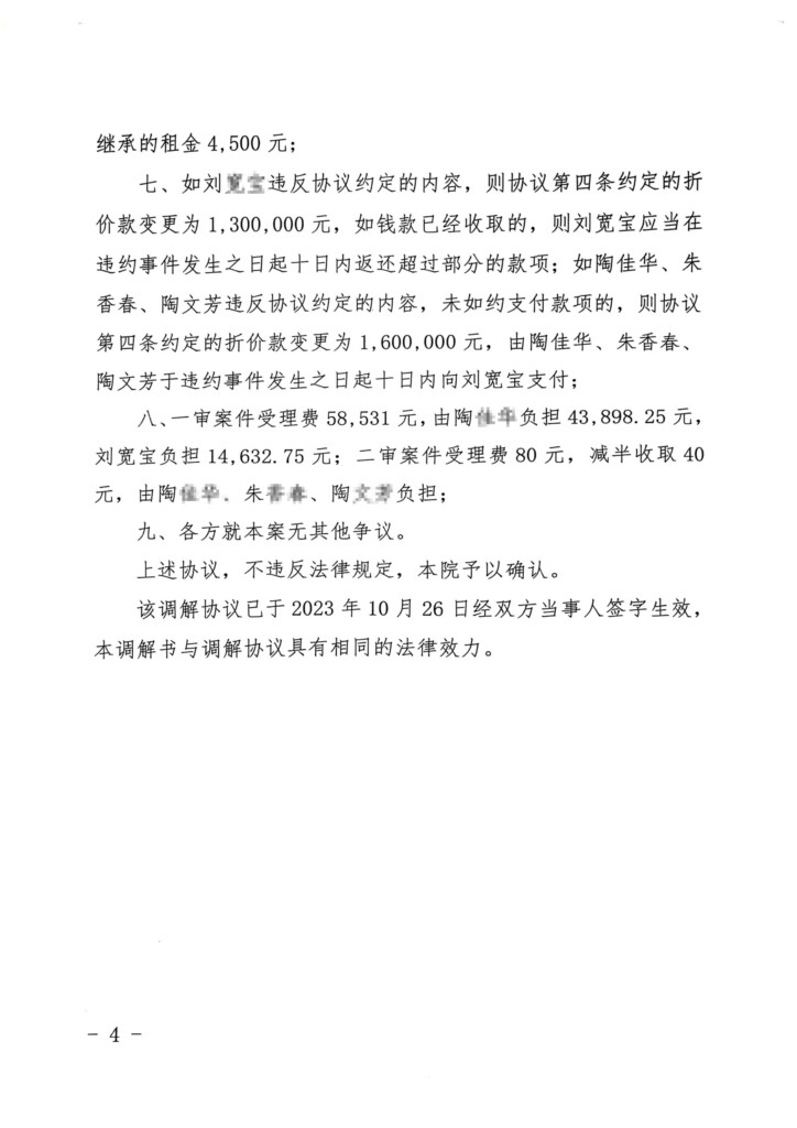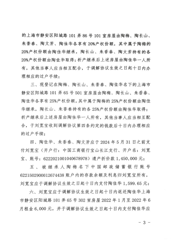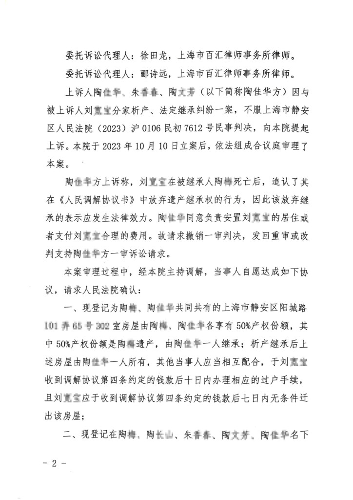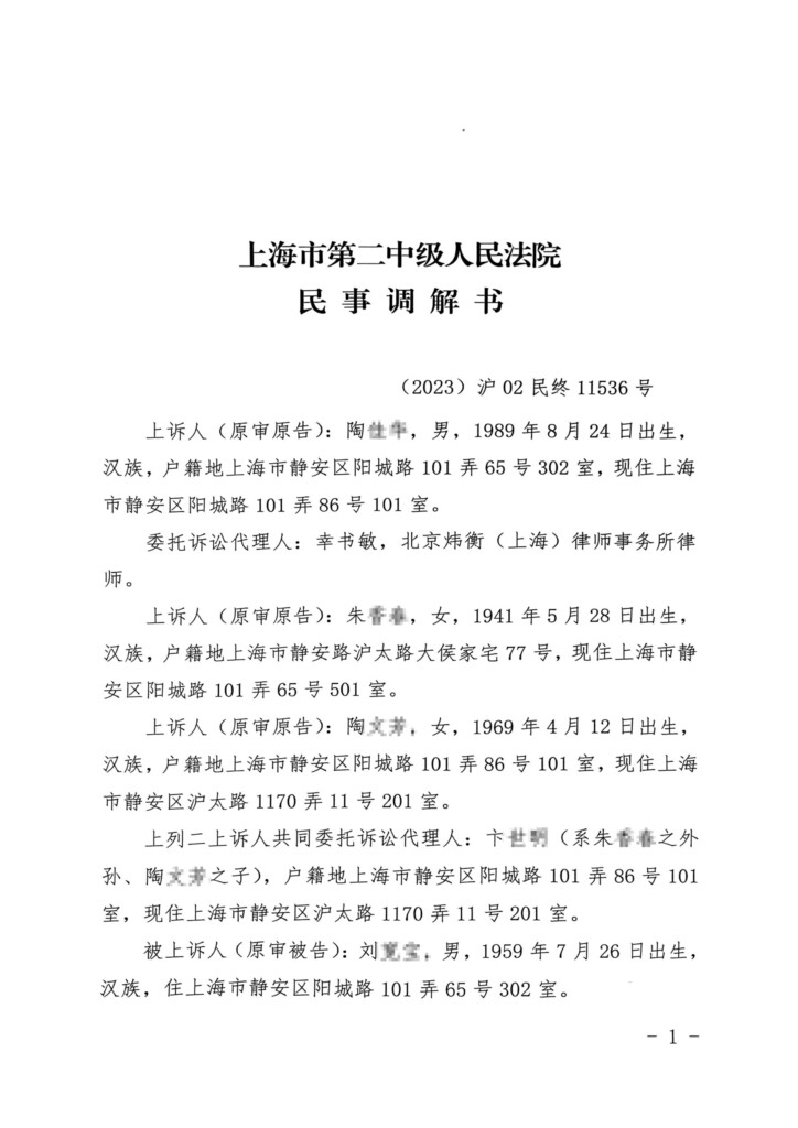 (2023)沪02民终11536号-刘宽宝与陶佳华、朱香春、陶文芳分家析产、法定继承纠纷民事调解书_页面_1
