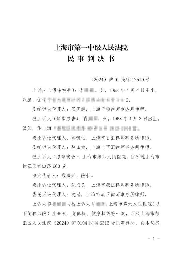 (2024)沪01民终17510号-肖娟萍与李德敏、上海市第六人民医院生命权、身体权、健康权纠纷民事判决书_页面_01